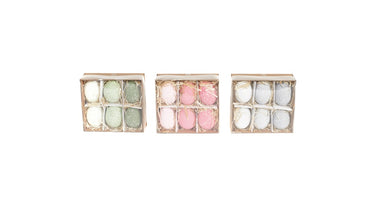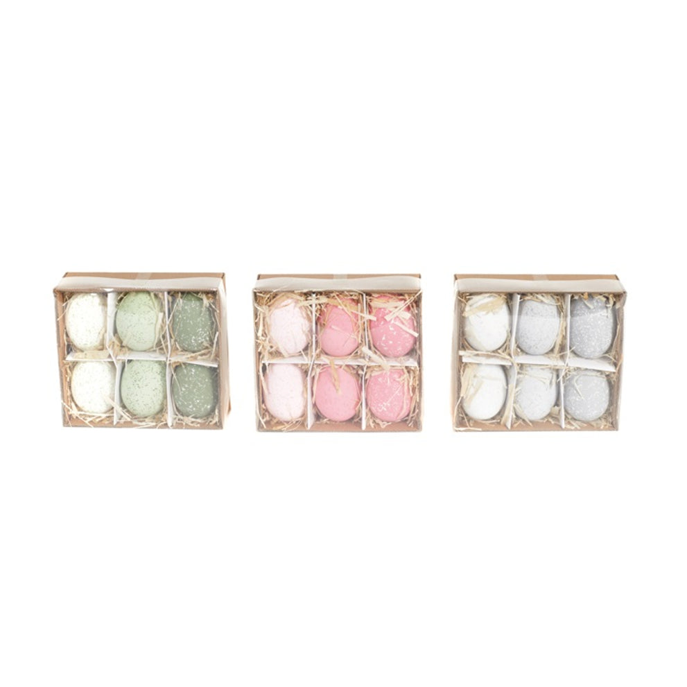 6 Real Eggs 6cm with Pendant Painted Pink, Green, and Gray in a Brown Box - 3 Assorted