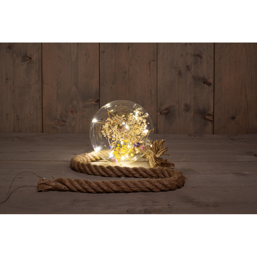 BO BALL GLASS WITH DRY FLOWER WHITE/YELLOW/PURPLE 15CM ON ROPE / LED