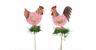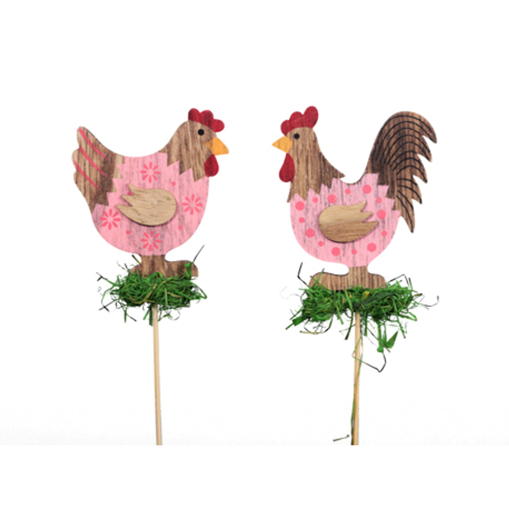 cb. 10 wooden chickens/stick 2 ass pink 7.5x8cm