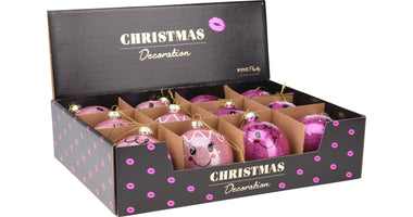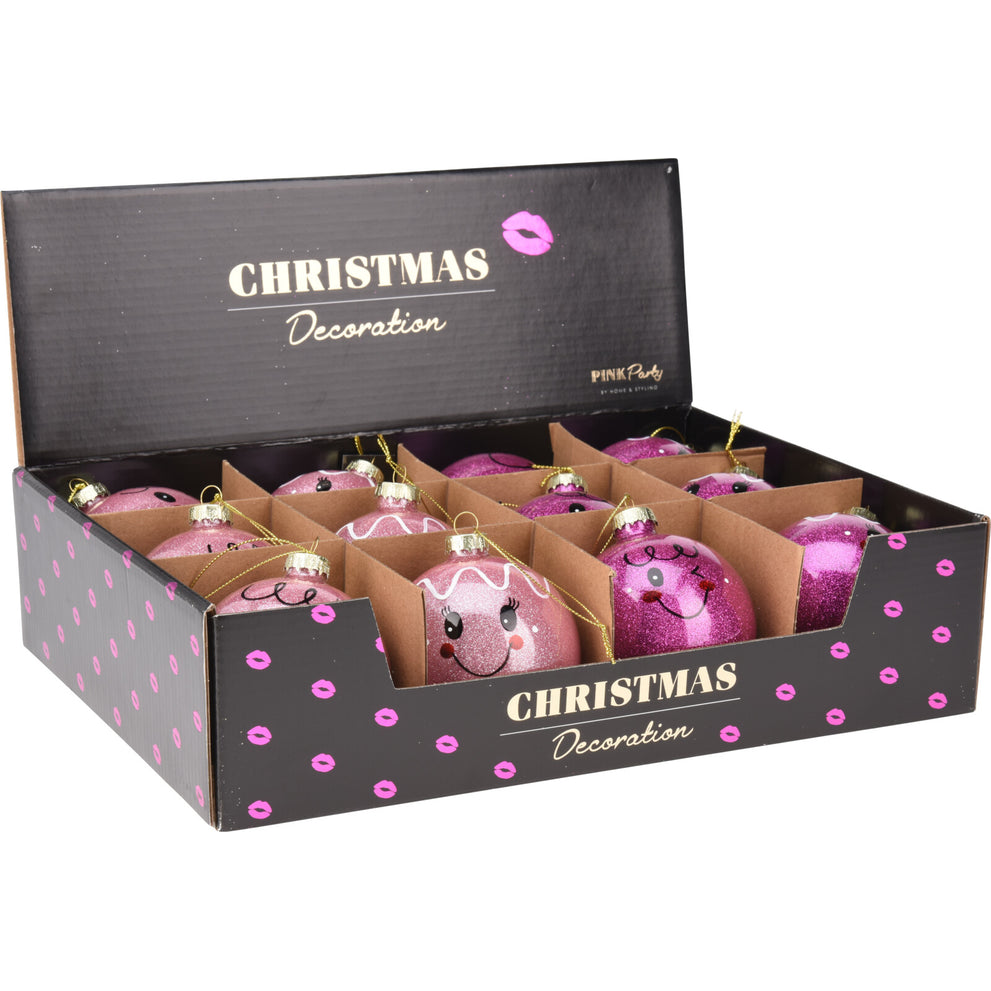 CHRISTMAS BALL GLASS D8 CM FACE PINK FUCHSIA 4 ASSORTED