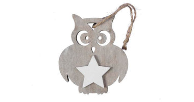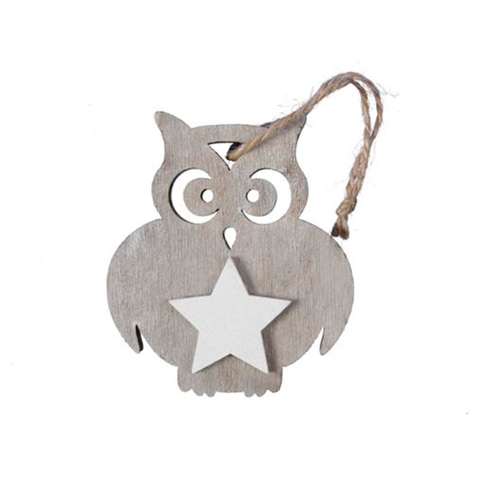 pm. 8 wooden owls/hanging grey/white 7 cm