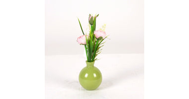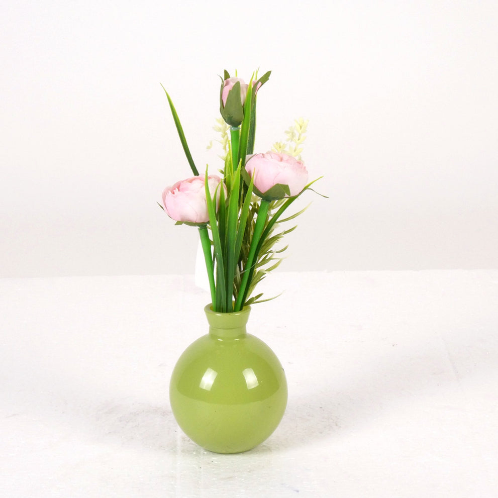 Ranunculus in green glass vase H22cm pink