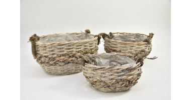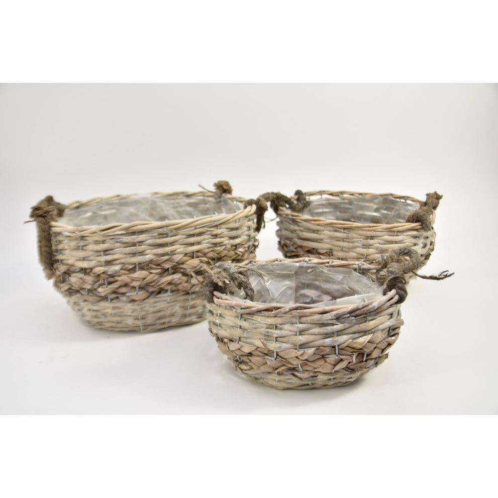 Set of 3 oval baskets with jute ears, seagrass/reed, 34x27x17cm, gray