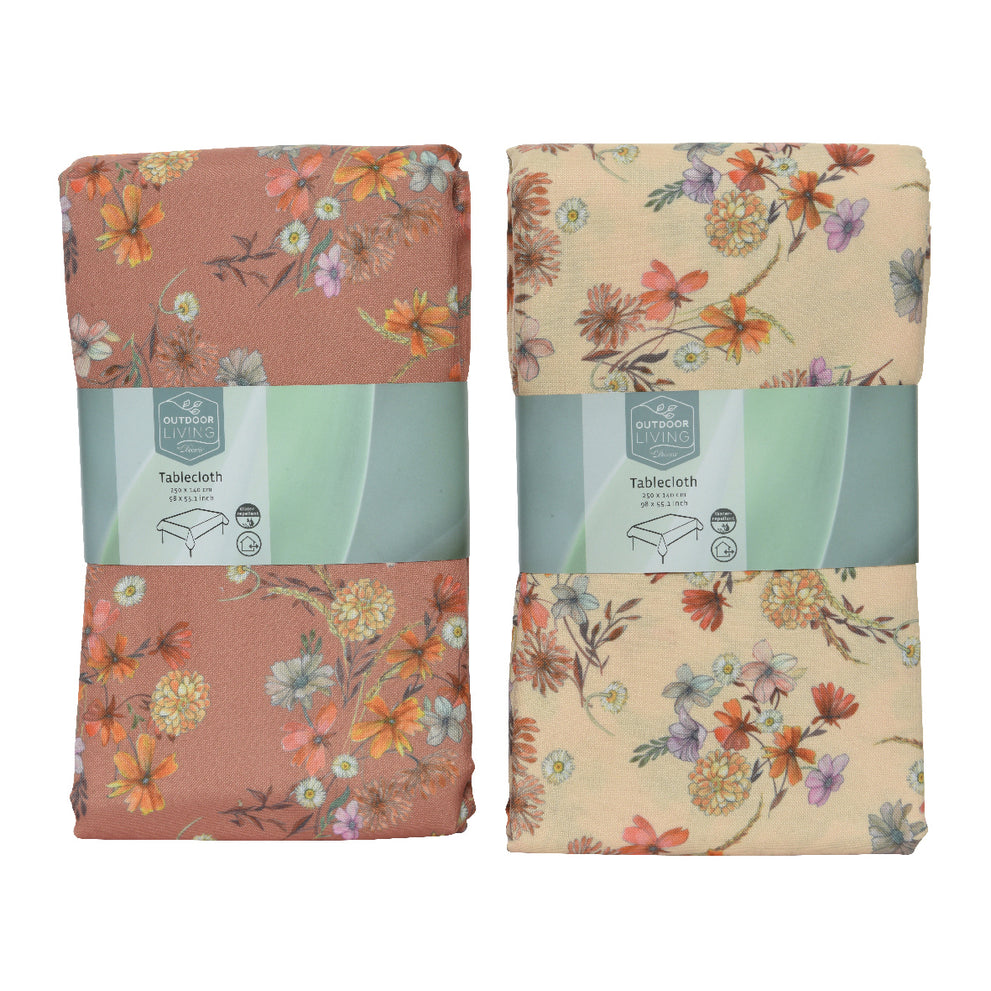 Tablecloth polyester oblong flowers 2col assorted outdoor 140x250cm