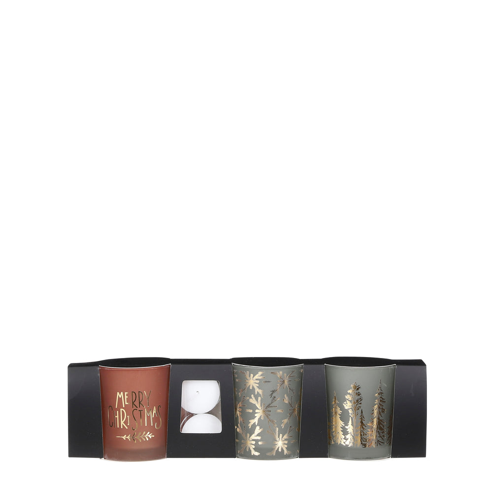 Brown green tea light holder, set of 3, incl. tea light - h8xd7cm