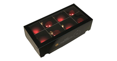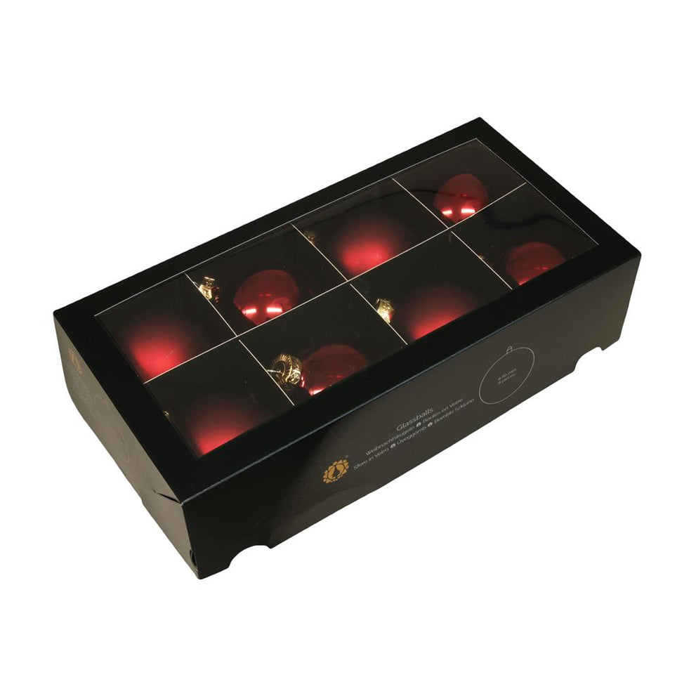 w/b. 8 glassballs/cap dark red combi 80 mm