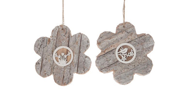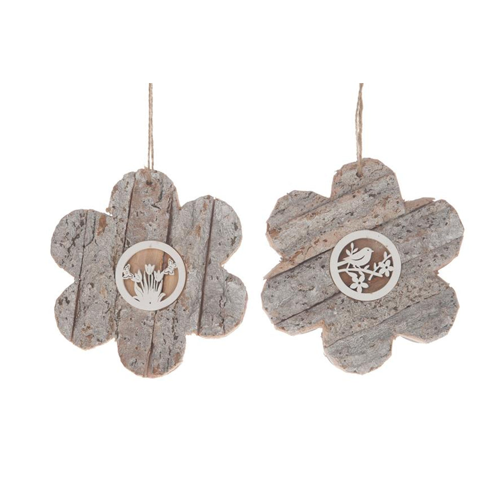 Wooden flower with bark pendant 15x15x1.5cm 1pc 2 assorted Wh