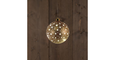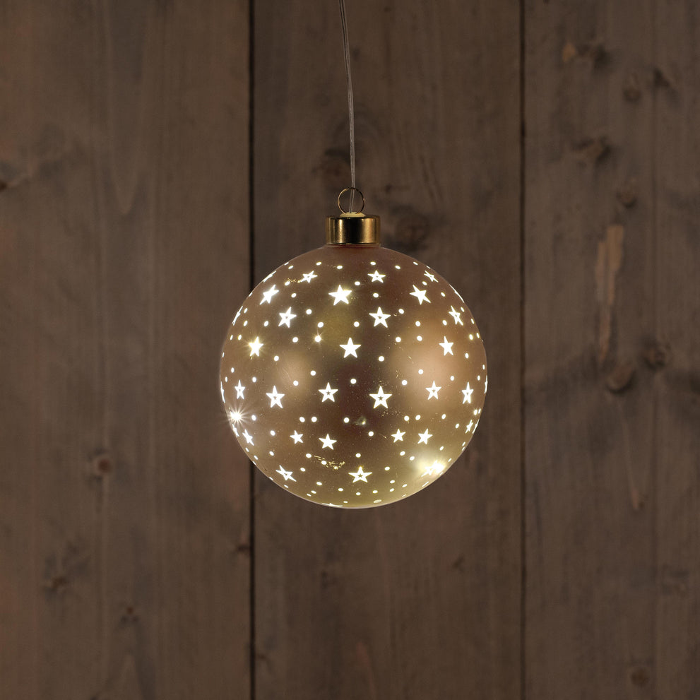 B.O. GLAS BAL MAT GOUD MET STERREN 12CM /LED WARM WIT - 2XAAA