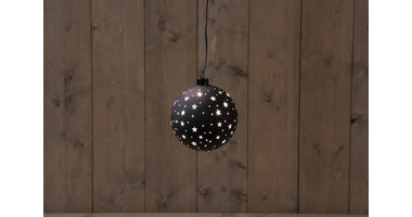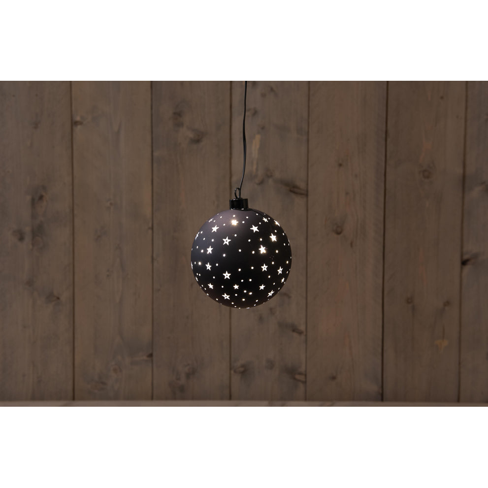 B.O. GLAS BAL ZWART MET STERREN 12CM / LED WARM WIT - 2XAAA