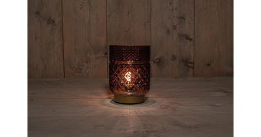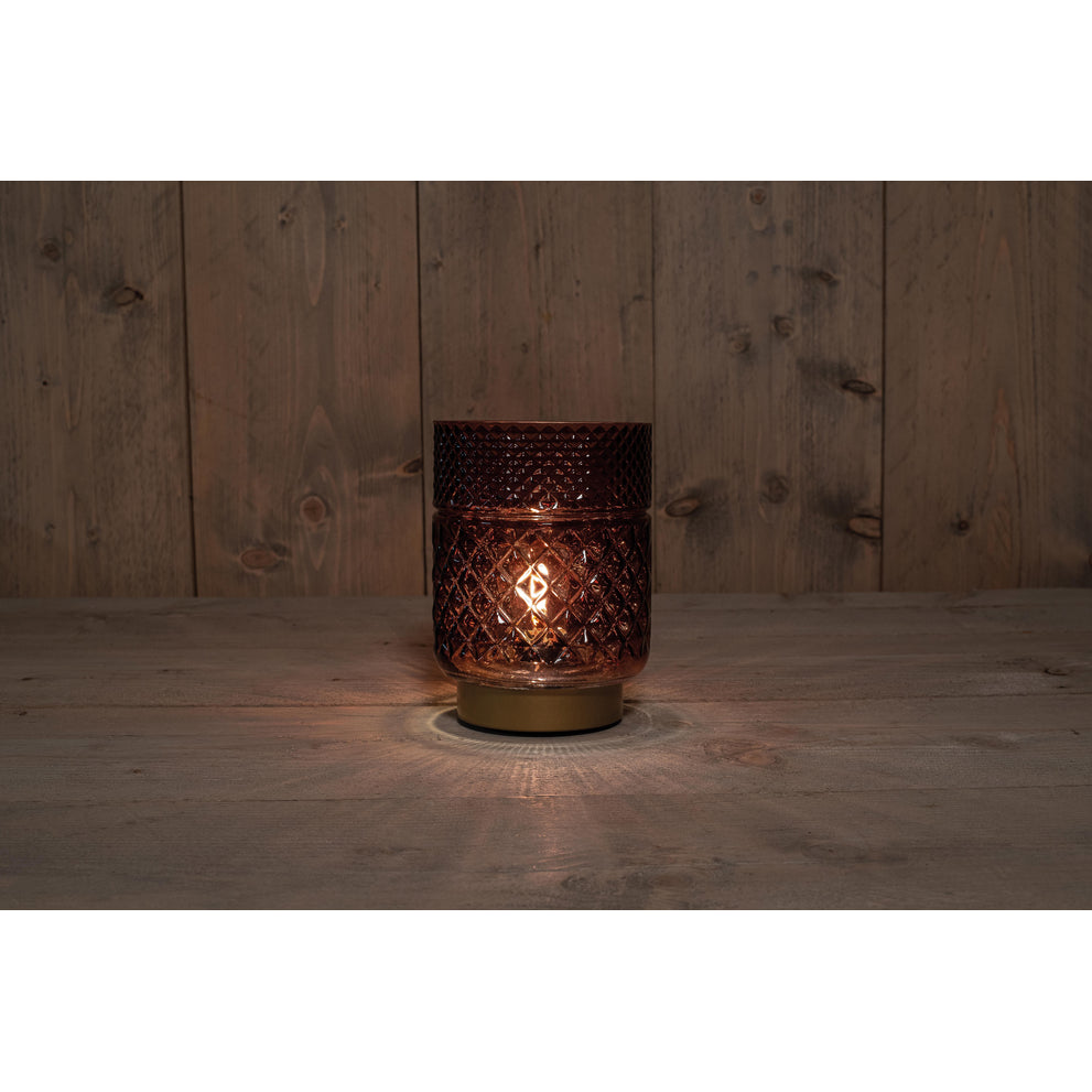 B.O. GLAZEN LAMP BORDEAUX MET GOUDEN VOET 12X17,5CM - 2XAAA