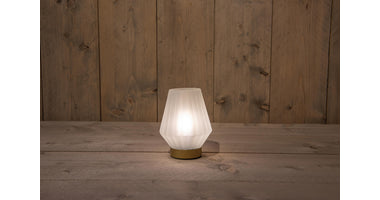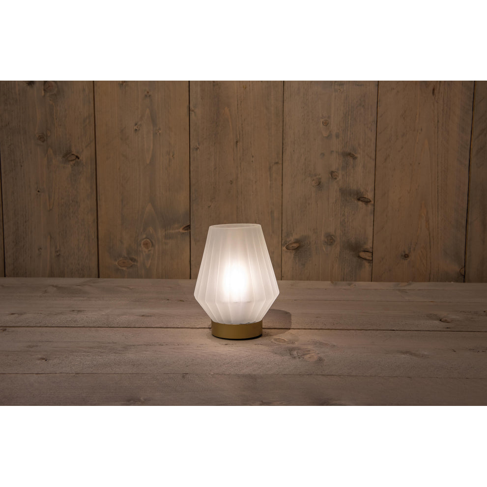 B.O. GLAZEN LAMP MAT WIT MET GOUDEN VOET 12X17CM 2XAAA
