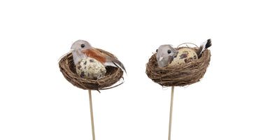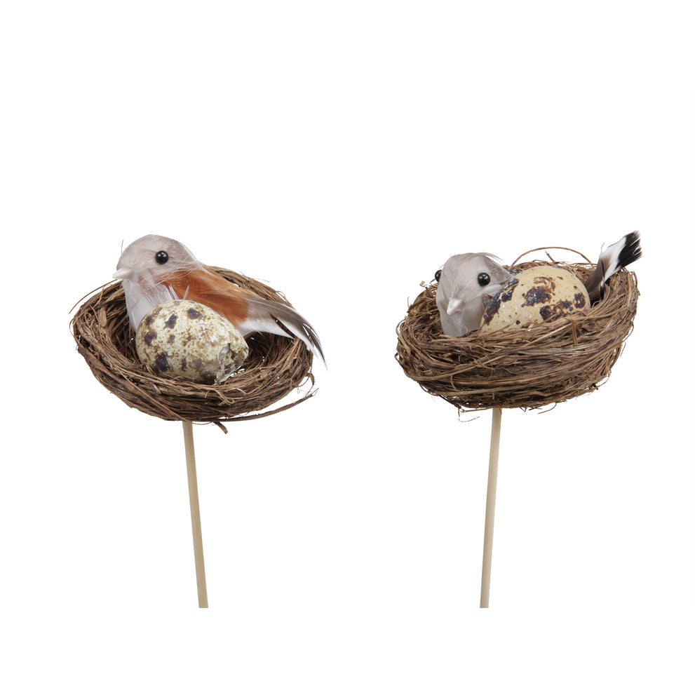 Doos á 6 nestjes met vogel en ei op stok natural Ø 7cm