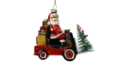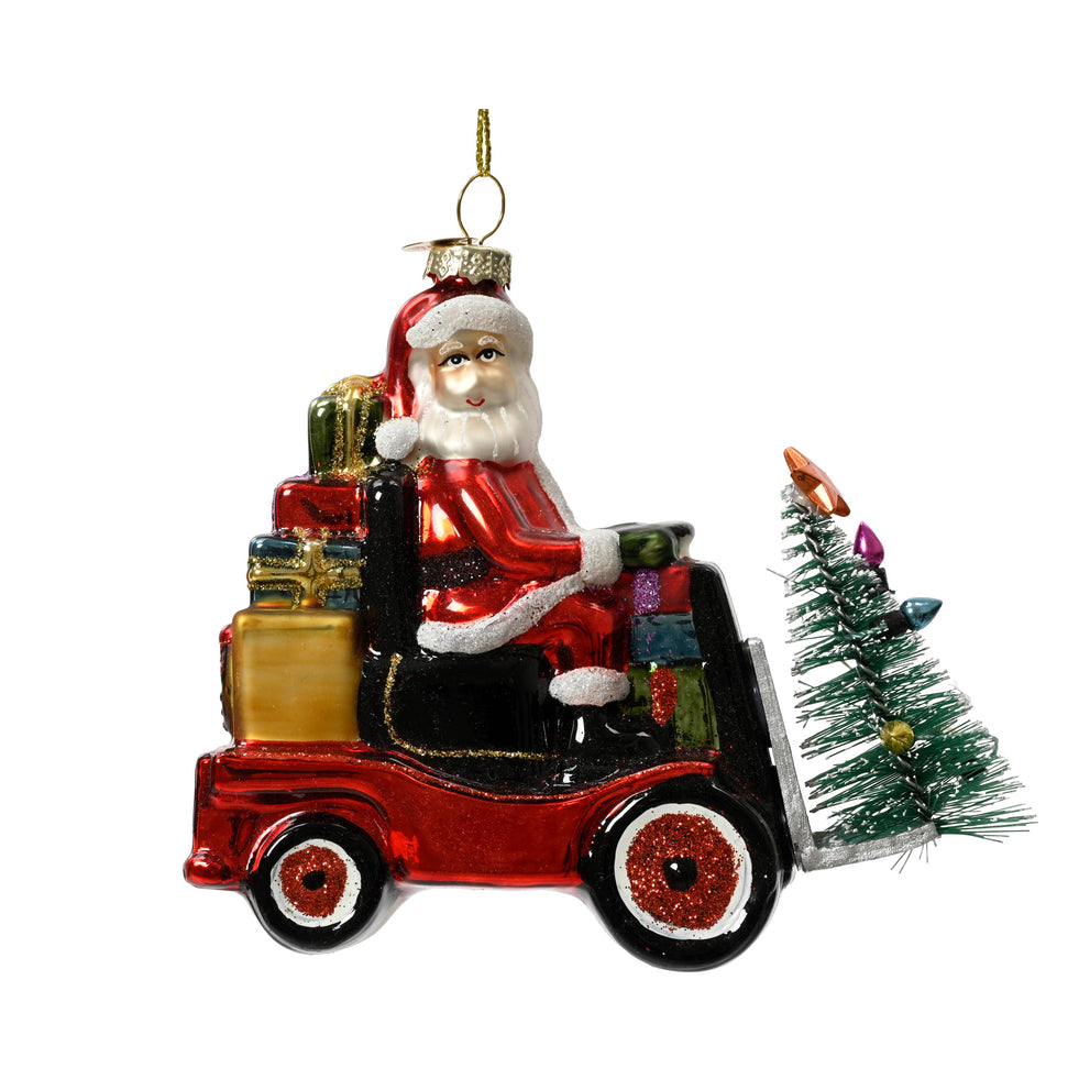 Hanger Kerstman op heftruck glas 4,5x11,5x12cm