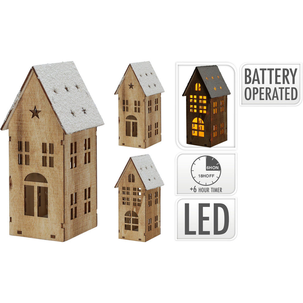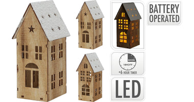 HOUTEN HUIS + SNEEUW 8X9X18CM MET LED/TIMER EXCL. 2X AAA 2 ASSORTIE