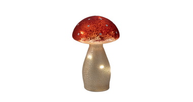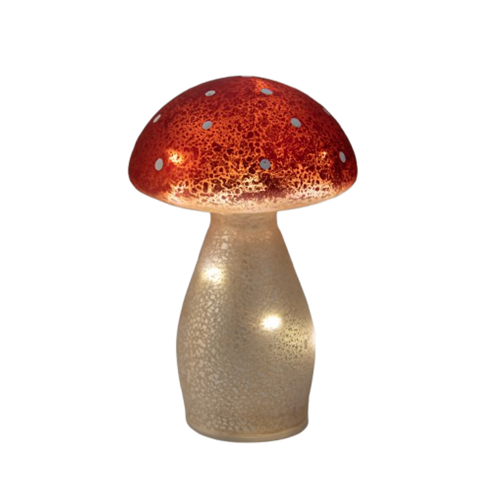 PADDENSTOEL GLAS LED OP BATTERIJ MET TIMER H18CM ROOD MET WITTE STIPPEN