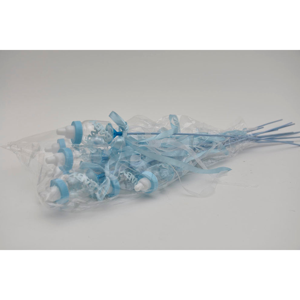 Pak á 12 Baby flesje blauw met lint op stok 50cm