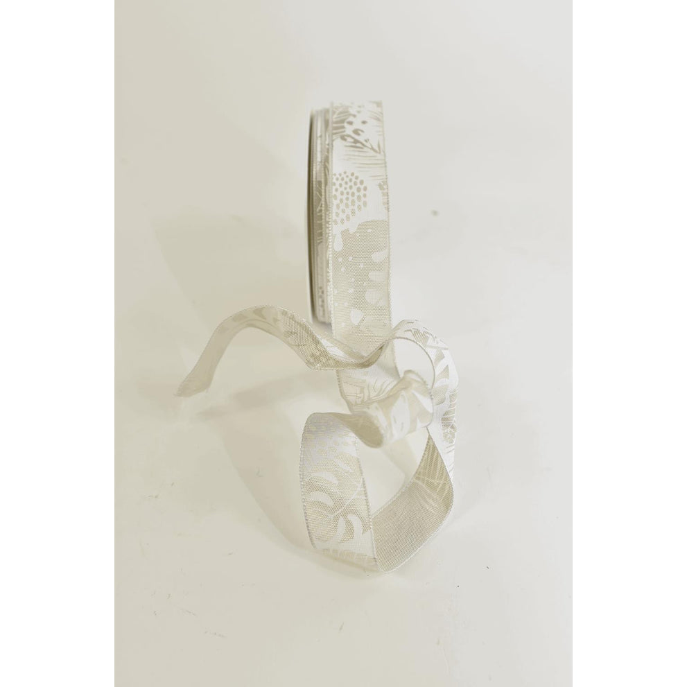 Satijnlint met opdruk bladeren 25mm 20mtr linnen/wit