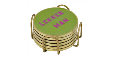 Set van 6 onderzetters met tekst in rekje 10x10x5cm