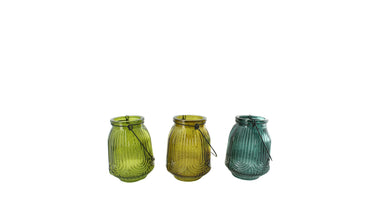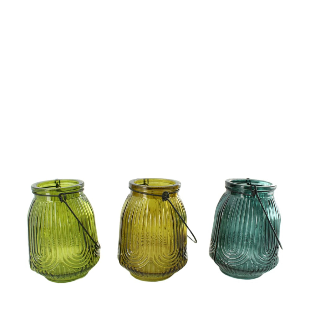Tealight holder glass with handle 9x9x12.5cm 3 assorti green