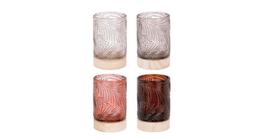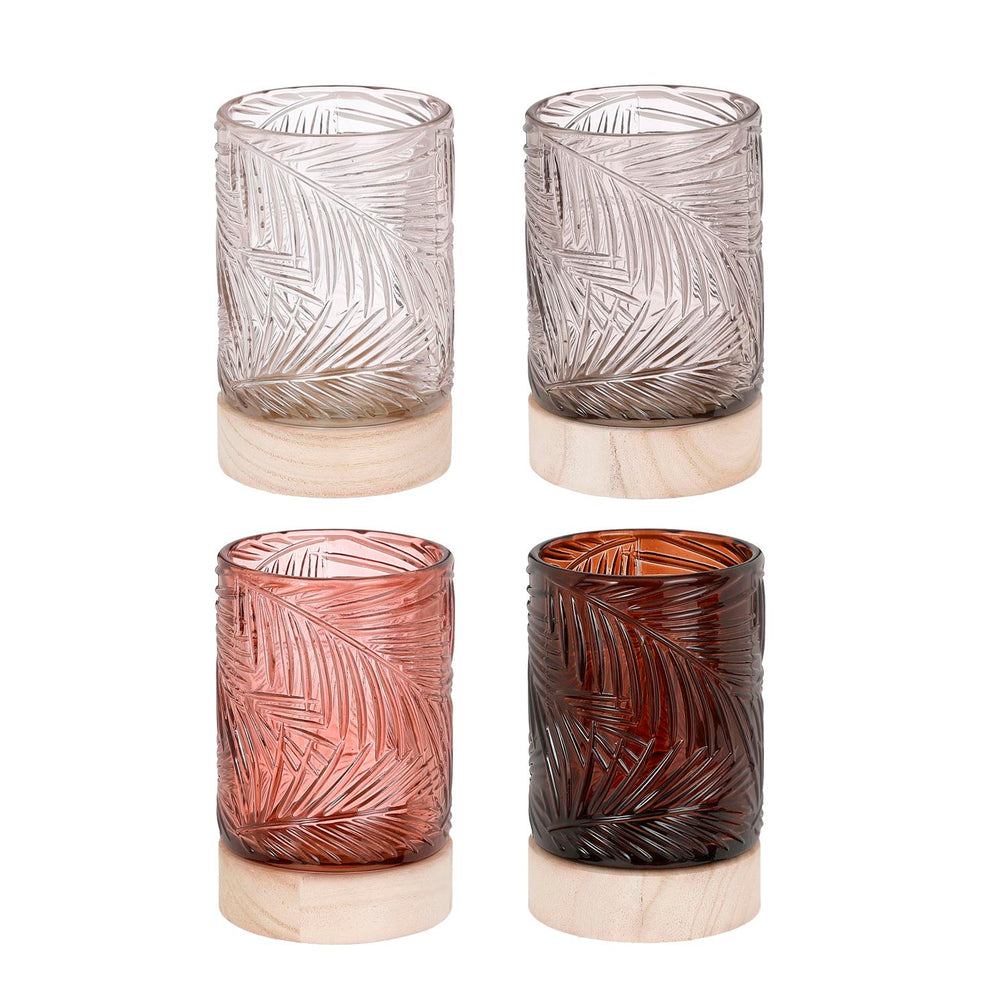Theelicht houder op houten voet offwhite grijs roze bruin 4 assortie h14xd8,5cm