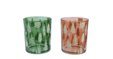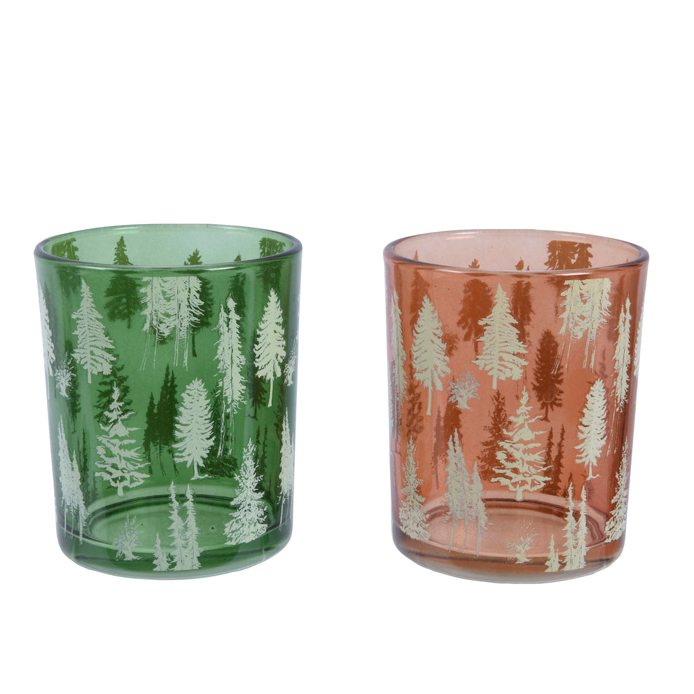 Theelichthouder glas ''bomen'' 2 kleur assortie D7 H8,3cm