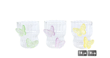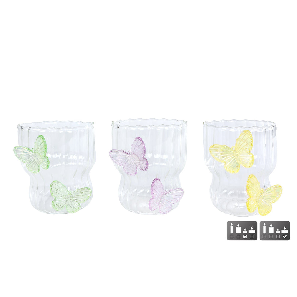 Theelichthouder glas "Butterfly" roze/groen/geel 3 assortie 7,5x6,5x9cm