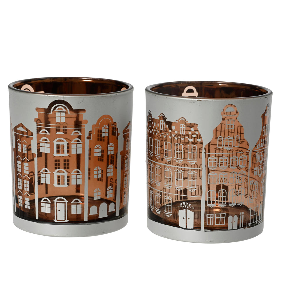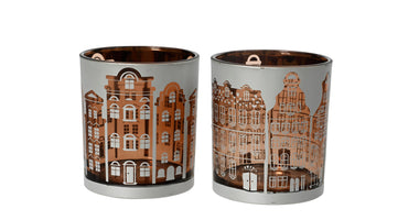 Theelichthouder glas ''grachtenpand'' 2 assortie D8 H9cm