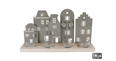 Theelichthouder "Straat" 4x offwhite metaal/hout 38x8,5x20cm