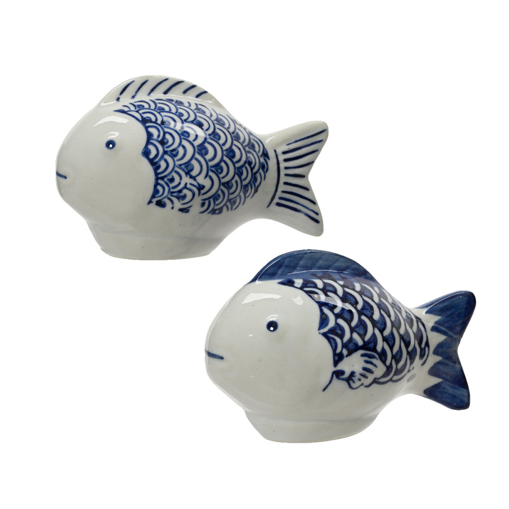 Vis porselein 2 assortie blauw/wit L.8.7cm x W.5cm x H.6cm
