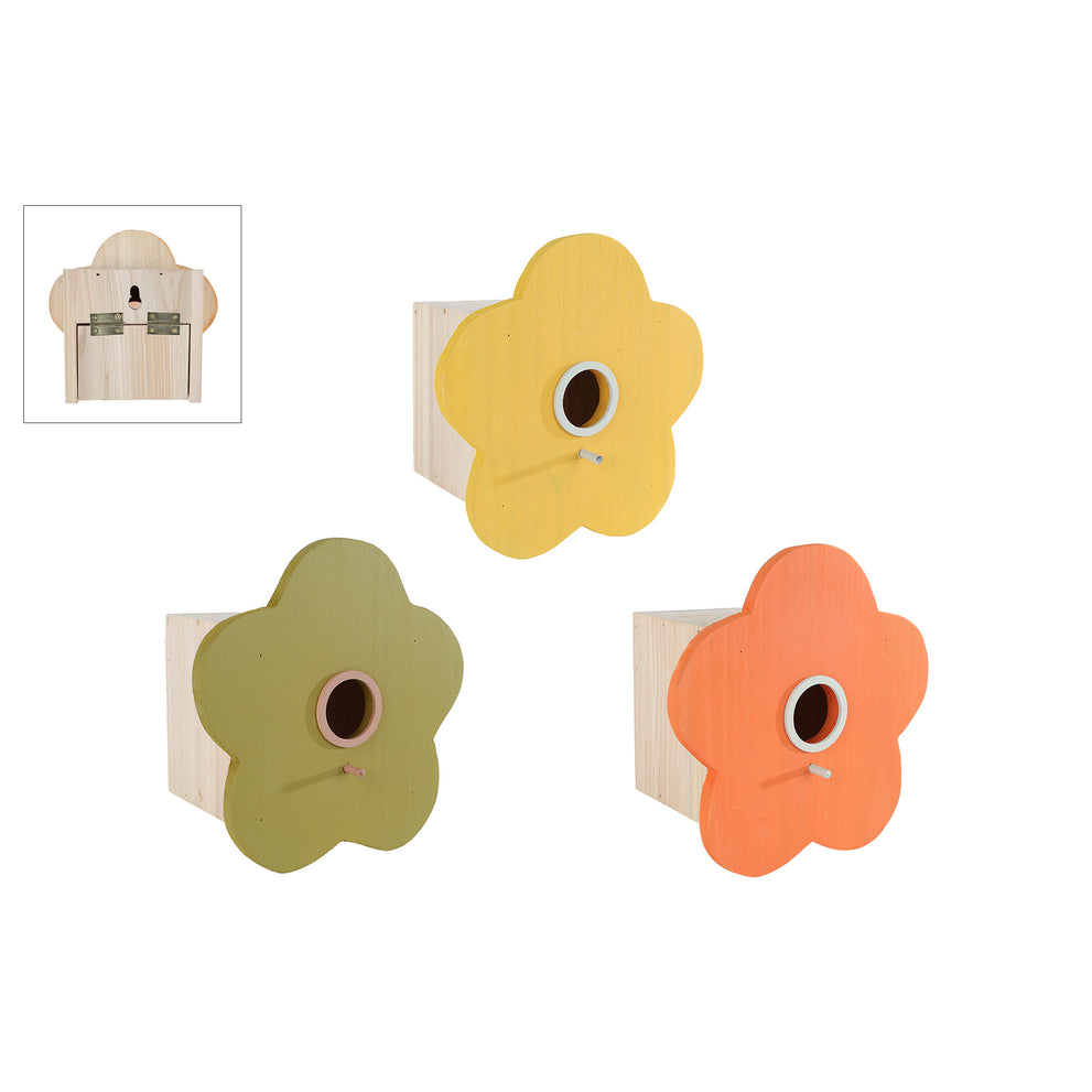 Vogelhuisje "Flower" geel/oranje/groen 3 assortie hout 16x10x16cm