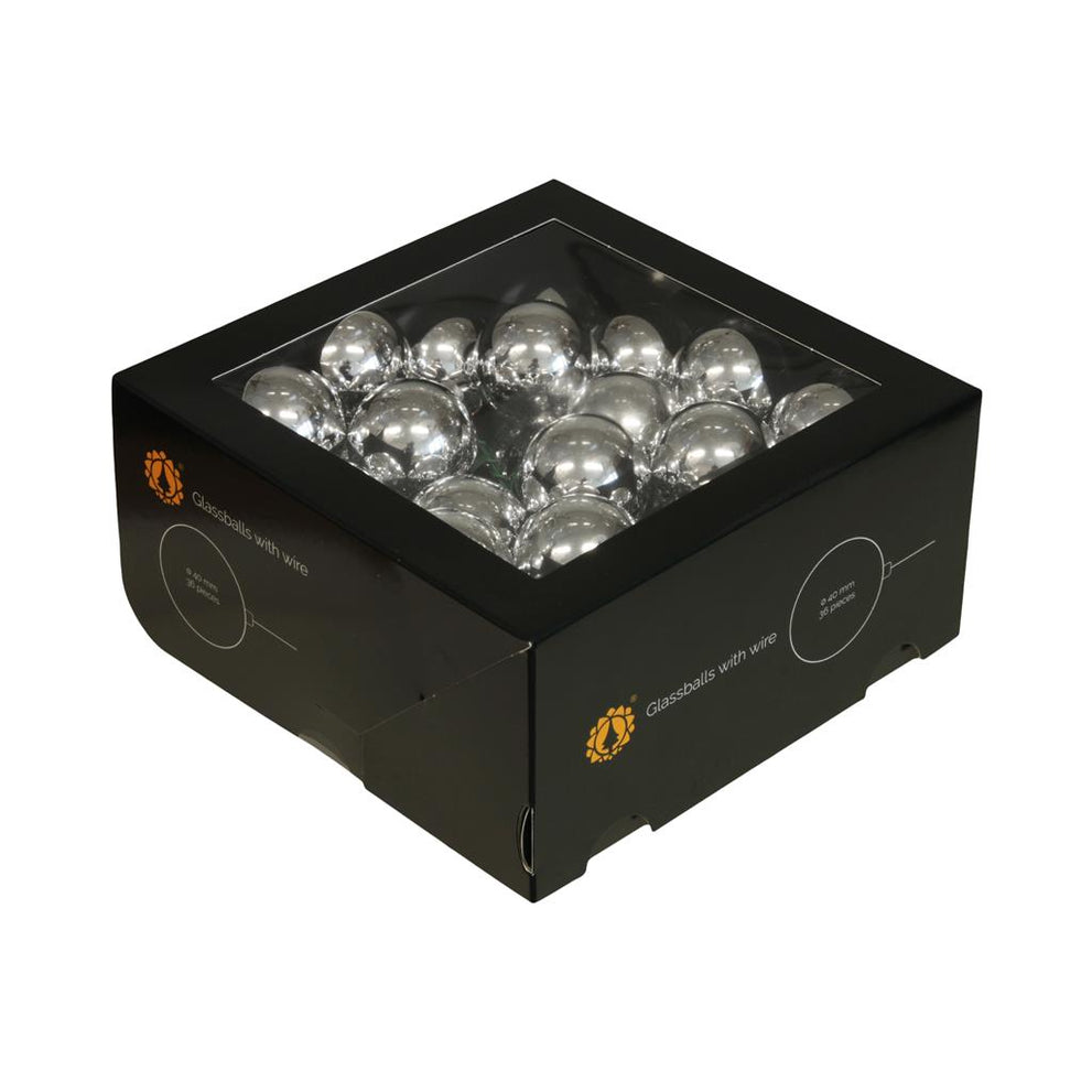 w/b. 36 glassballs/wire silver shiny 40 mm