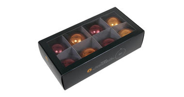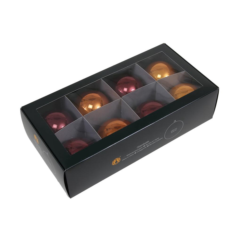 w/b. 8 glassballs/cap caramel brown 80 mm