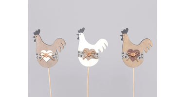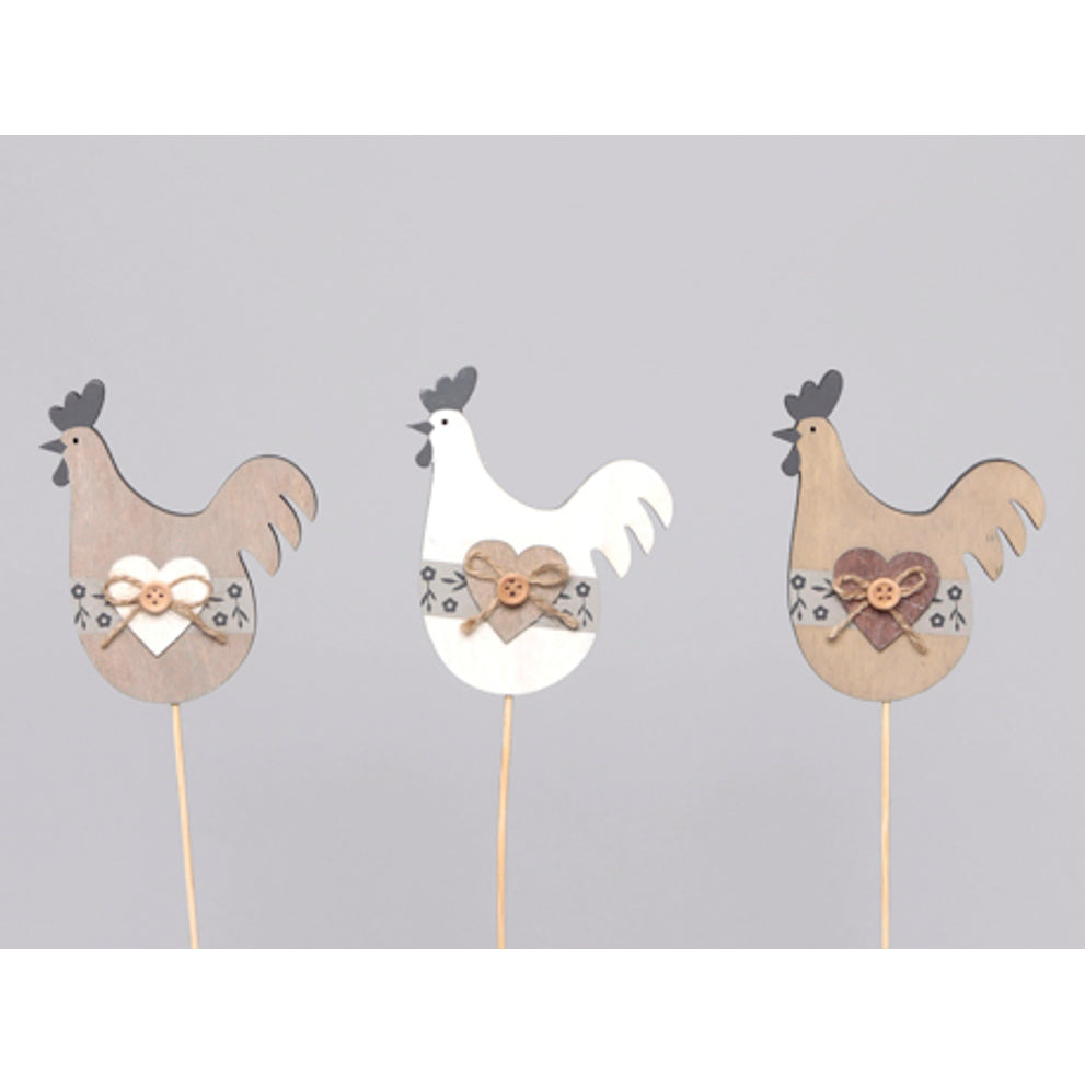 w/b. 9 wooden roosters/stick white/grey/natural 8.5x10 cm